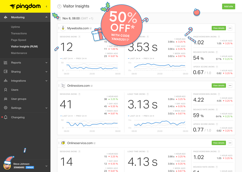 Gain visibility into how actual end users are interacting with and experiencing your website with scalable and easy-to-use Real User Monitoring (RUM). With Pingdom RUM you can:
